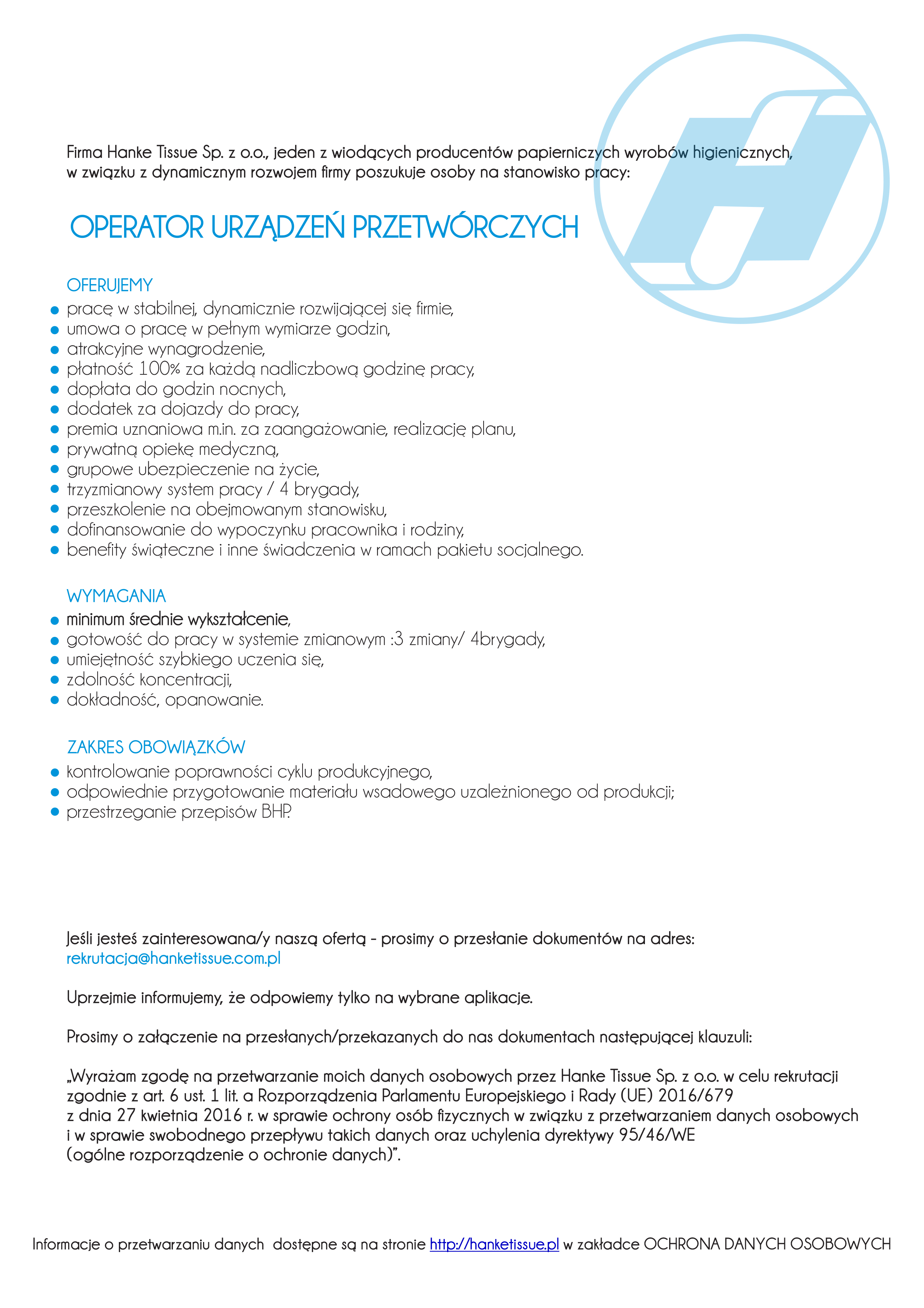 „Wyrażam zgodę na przetwarzanie moich danych osobowych przez Hanke Tissue Sp. z o.o. w celu rekrutacji zgodnie z art. 6 ust. 1 lit. a Rozporządzenia Parlamentu Europejskiego i Rady (UE) 2016/679 z dnia 27 kwietnia 2016 r. w sprawie ochrony osób fizycznych w związku z przetwarzaniem danych osobowych i w sprawie swobodnego przepływu takich danych oraz uchylenia dyrektywy 95/46/WE (ogólne rozporządzenie o ochronie danych)”.